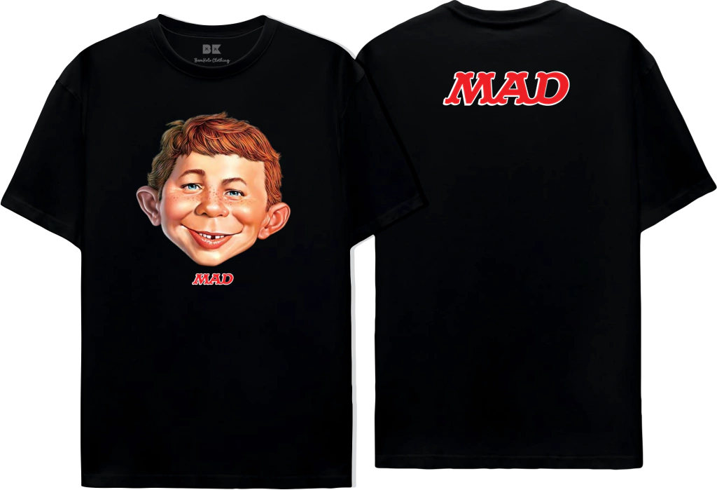 Estampa vibrante e exclusiva: produzida com a avançada tecnologia DTF, a estampa mantém as cores intensas e os detalhes nítidos mesmo após várias lavagens, preservando o visual impactante do personagem MAD.