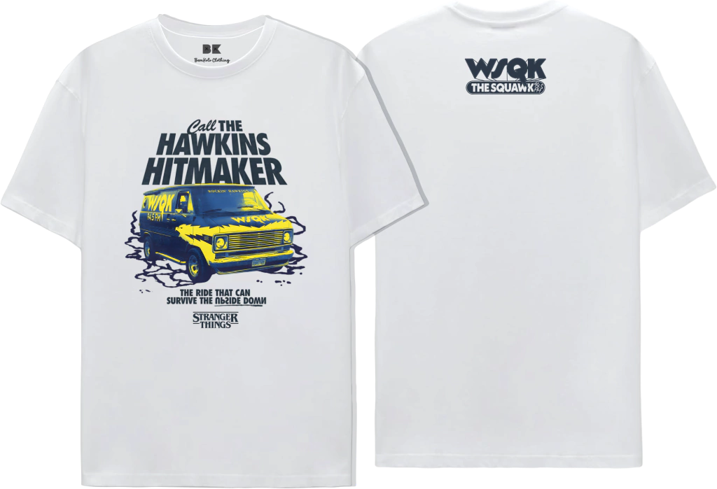 Diretamente das ondas sonoras de Stranger Things, a camiseta Hawkins Hitmaker traz a energia vibrante da fictícia estação WSQK 94.5 FM – The Squawk, comandada por Rockin’ Robin! Uma homenagem ao espírito retrô dos anos 80, com um visual que mistura o charme das rádios clássicas à identidade marcante da série que conquistou o mundo.